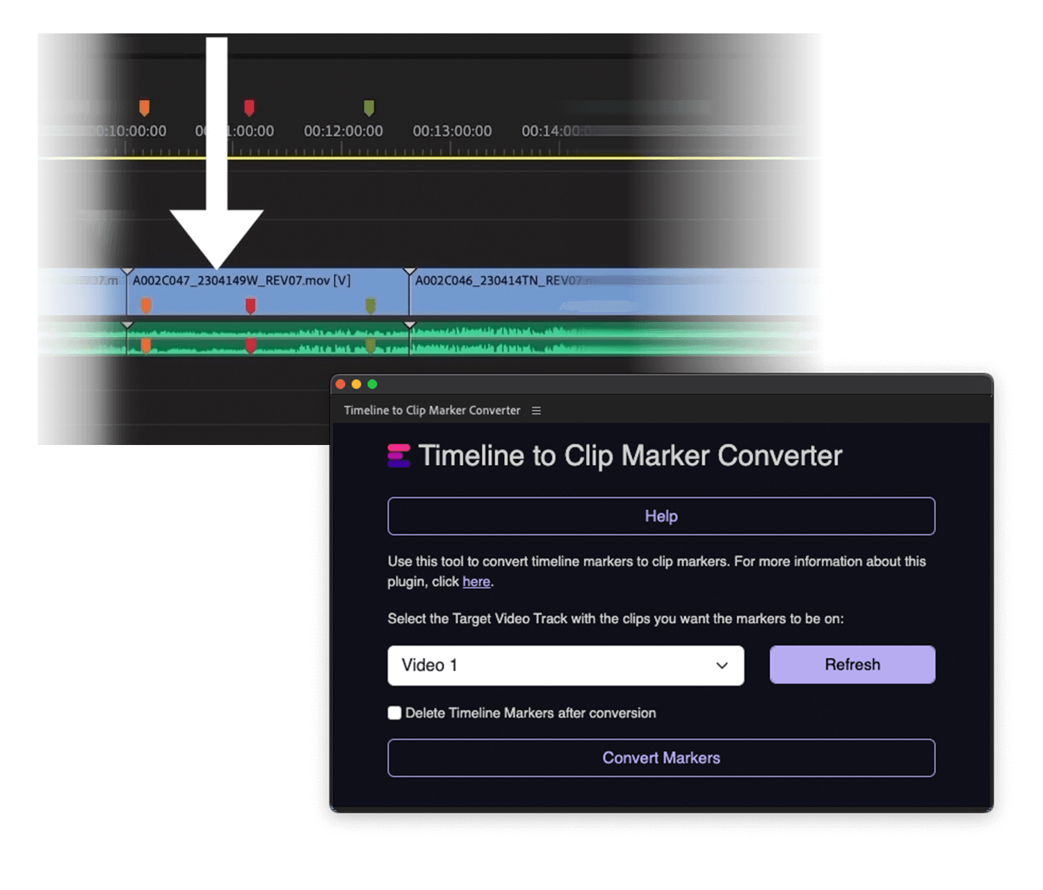 Dzięki tej wtyczce możesz łatwo przekonwertować wszystkie znaczniki osi czasu na znaczniki klipów. Możesz także wybrać warstwę wideo, na której chcesz je umieścić i automatycznie usunąć znaczniki osi czasu po konwersji. Użyj tej wtyczki, aby umieścić wszystkie znaczniki osi czasu na klipach wideo.