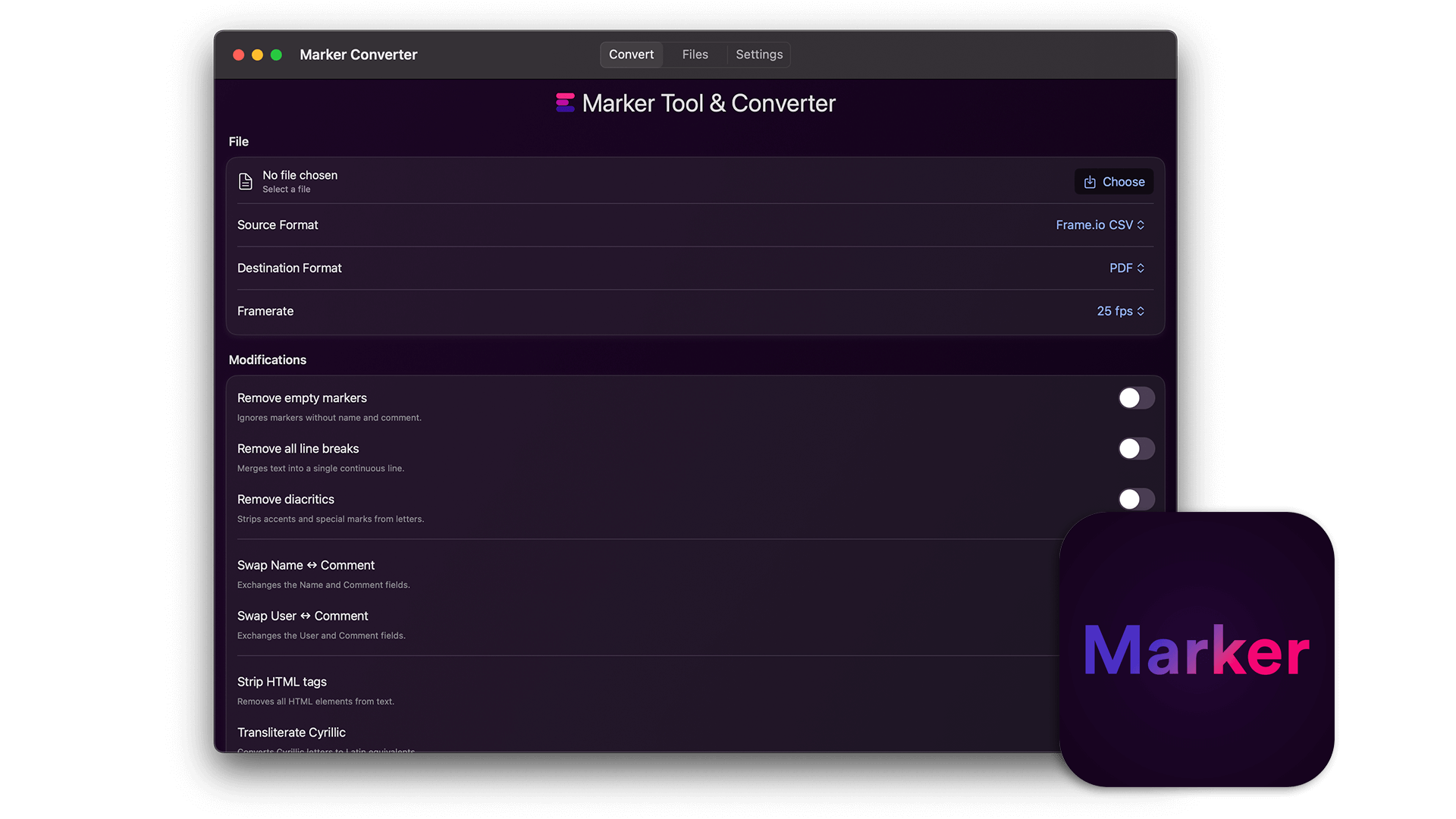 This app is a smaller version of our online marker converter and works completely offline.